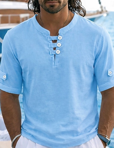 Herren Leinenhemd Poloshirts Lässig Urlaub Kragenlos Kurzarm Urlaub Modern Einfach Farbblock Knöpfe Sommer Frühling Blau Weiß Gelb Rote Grau Leinenhemd