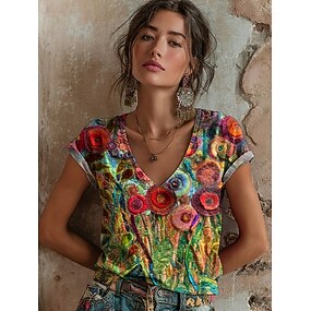 Damen T Shirt Druck Blumen Grafik Graffiti Bohemien Vintage Lässig Kurzarm V Ausschnitt Normale Oberteile Täglich Blau Himmelblau Purpur Orange Braun Sommer Frühling