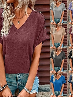 Damen T Shirt T-Shirt Knöpfe Einfach Mode Stilvoll Klassisch Kurzarm V Ausschnitt Normale Oberteile Täglich Ausgehen Wochenende Blau Schwarz Wein Marineblau Purpur Sommer Frühling