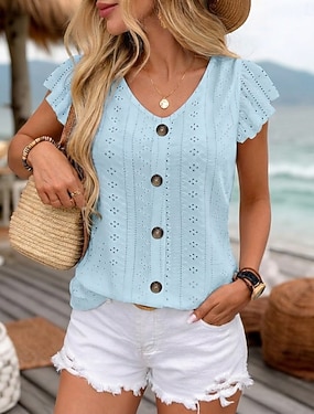 Damen Bluse Einfarbig Basic Lässig Kurzarm V Ausschnitt Normale Oberteile Täglich Blau Schwarz Weiß Rote Marineblau Sommer