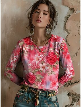 Damen T Shirt Druck Blumen Grafik Pflanzen Vintage Mode Stilvoll Langarm Rundhalsausschnitt Rundhals Normale Oberteile Täglich Wochenende Rosa Frühling Herbst Winter