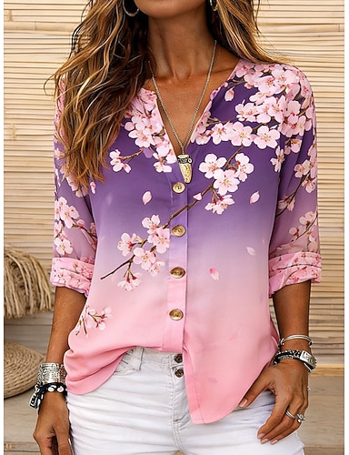 Damen Hemd Tunika Sommeroberteile Knöpfe Ombre Blumen Grafik Urlaub Täglich Dreiviertelarm V Ausschnitt Lange Oberteile Täglich Ferien Ausgehen Rosa Purpur Sommer Frühling