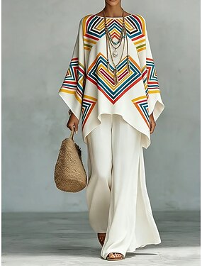 Damen Hemd Baumwoll-Leinen-Sets Hosen-Sets Langarm Dreiviertelarm Glockenärmel Rundhals Grafik Geometrisch Druck Urlaub Mode Streetwear Lässig Täglich Outdoor Weiß Marineblau Frühling & Sommer