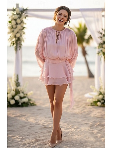 Zweiteilig A-Linie Kurz Mini Kleid für Hochzeitsgäste Kleider für Hochzeitsgäste Elegant Täglich Langarm Rundhalsausschnitt Abschlussball Formell mit Falten Gerafft