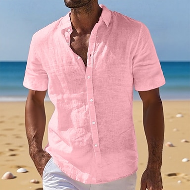 Herren Leinenhemd Sommerhemd Strandbekleidung Knopfhemd Einfach Urlaub Kreuzfahrt Schwarz Weiß Hellgrün Rosa Kurzarm Umlegekragen Sommer Bekleidung