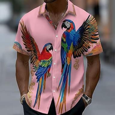 Herren Vogel Papagei Sommer Hawaiihemd Tropische Hemden Alohahemd Kurzarm Hawaiianisch Urlaub Strandbekleidung Sommer Frühling Umlegekragen 3D-Druck Hemden mit Knopfleiste Blau Gelb Rosa Purpur Grün
