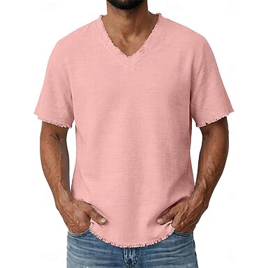 Herren T-Shirt Leinen-T-Shirt Kurze Ärmel V Ausschnitt Sommer Einfach Mode Designer Basic Weich Rein Rohkante Lässig Strand Urlaub Blau Weiß Rosa Top T-Shirt für Herren