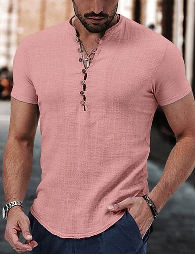 Herren Leinenhemd Stehkragenhemd Popover-Hemd Sommerhemd Strandbekleidung Freizeithemd Einfach Urlaub Lässig Schwarz Weiß Rosa Wein Kurzarm V Ausschnitt Sommer Bekleidung