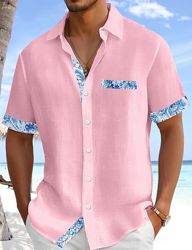 Herren Hemd Leinenhemd Sommerhemd Strandbekleidung Knopfhemd Blumenmuster Urlaub Kreuzfahrt Weiß Rosa Grün Leicht Blau Kurzarm Kragen Sommer Frühling & Sommer Bekleidung Grafik