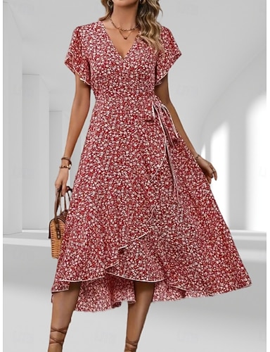 Damen Midikleid Freizeitkleid Wickelkleid Blumenkleid Elegant Mode Modern Outdoor Urlaub Ausgehen Normale Passform Blumen Kurzarm V Ausschnitt Schwarz Gelb Rosa Rote Sommer Frühling