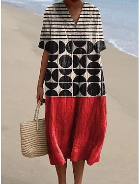 Damen Midikleid Sommerkleid Urlaub Lässig Strand Strand Party Lässiger Schnitt Grafik Geometrisch Abstrakt Kurzarm V Ausschnitt Marineblau Rote Orange Hellgrau Sommer Frühling