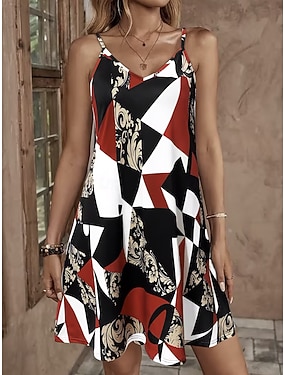 Damen Minikleid A Linie Kleid Unterkleid Schulterfreies Kleid Urlaub Lässig Strand Ausgehen Lässiger Schnitt Grafik Geometrisch Ärmellos V Ausschnitt Rote Sommer Frühling
