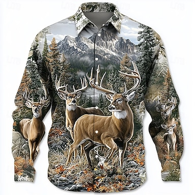 Herren Rentier Natur Wald Hemd Knopfhemd Langarm Vintage-Retro Outdoor Campen und Wandern Jagd Frühling Herbst Umlegekragen 3D-Druck Hemden mit Kragen Blau Khaki Hellgrau Grau Leicht Blau