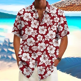 Herren Blumendruck Tropische Blumen Sommer Hawaiihemd Knopfhemd Alohahemd Kurzarm Hawaiianisch Urlaub Ferien Strandbekleidung Sommer Umlegekragen 3D-Druck Eine Tasche vorne Leinenähnliches Hemd Rote