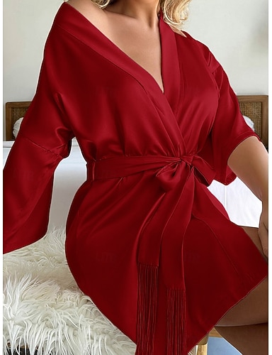 Damen Robe Lässig Weich Satin Einfarbig Schnürung Täglich Heim Bett Langarm V Ausschnitt Schwarz Rosa Rote Khaki Sommer Normale Passform