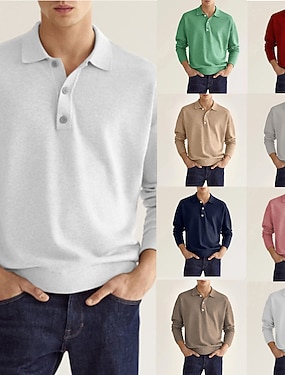 Herren Golfhemd Strickpolo Strasse Casual Polo-Kragen Klassisch Langarm Modisch Brautkleider schlicht Feste Farbe Glatt Knopf vorne Einfach Frühling & Herbst Regular Fit Schwarz Weiß Hellgrün Rosa