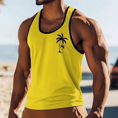 Herren-Tanktop im Hawaii-Stil mit tropischem Palmen-, Strand- und Sonnenuntergangsmotiv, ärmellos, U-Ausschnitt, für Sommer, Strandurlaub, Freizeit, Sport, Größen: S, M, L, XL, XXL, XXXL