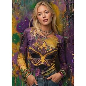 Karneval Damen T-Shirt Langarm Tee Grafik Lässig Langarm V-Ausschnitt Reguläre Oberteile Täglicher Cut Out Druck Lila Grün Frühling Herbst Vorsaison