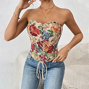 Damen Blumenspitze schulterfrei Vollbrustkorsett Bustier ohne Knochen Vollbrustkorsett Bodyshaper Dessous Top Rokoko Punk & Gothic