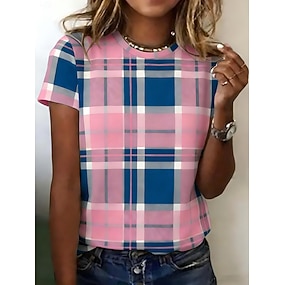 Damen T Shirt Druck Grafik Geometrisch Karomuster Vintage Stilvoll Klassisch Kurzarm Rundhalsausschnitt Rundhals Normale Oberteile Täglich Blau Weiß / blau Rosa Sommer Frühling Herbst