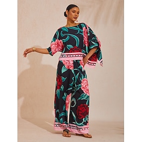 Urlaubs-Top aus Satin mit künstlerischem Blumenmuster, Dolmanärmeln