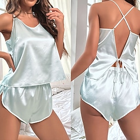 Damen-Pyjama-Sets mit Oberteil und Hose, einfarbig, schlicht, heiß, lässig, für zu Hause, für den Alltag, Satin-Seide, atmungsaktive Träger, ärmelloses Trägertop, Shorts, rückenfrei,