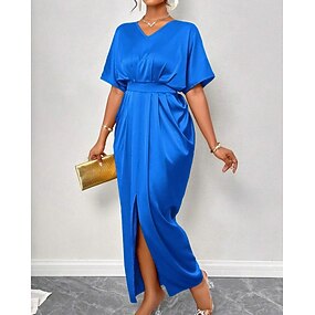 Damen Langes Kleid Maxikleid Satinkleid Partykleid Cocktailkleid Elegant Modern Abendgesellschaft Party Normale Passform Einfach Kurzarm V Ausschnitt Schwarz Gelb Königsblau Dunkelgrün Herbst Winter