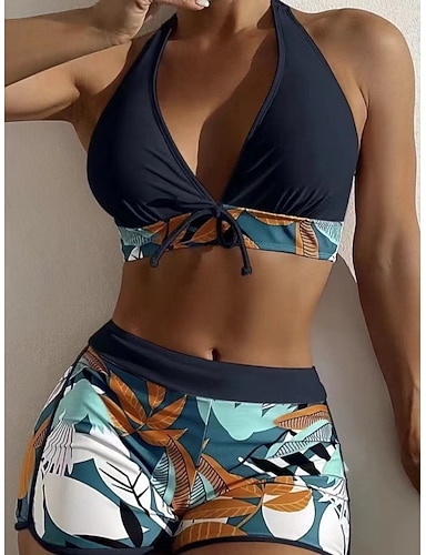 Damen Badeanzug Bikini Zweiteilig Shorts Bademode Schlank Rückenfrei Urlaub Strandbekleidung Blumen Neckholder Ärmellos Badeanzüge