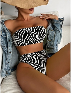 Damen Badeanzug Bikini Zweiteilig Slips Bademode Schlank Rückenfrei Urlaub Strandbekleidung Gestreift Trägerlos Ärmellos Badeanzüge