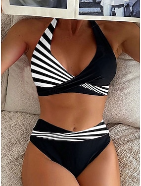 Damen Badeanzug Bikini Zweiteilig Hohe Taillenlinie Bademode Schlank Rückenfrei Urlaub Strandbekleidung Gestreift Neckholder Ärmellos Badeanzüge