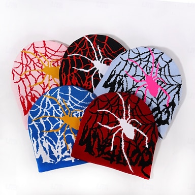 Herren Unisex Beanie Mütze Wintermützen Beanies Schädelkappe Strickmütze Hellblau Schwarz Acrylfasern Jacquard Gestrickt Gemütlich Halloween Alltagskleidung Festival Spinne Spinnennetz Warm
