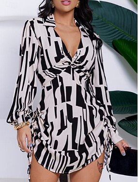 Damen Etuikleid Geometrisch Kordelzug Asymmetrischer Saum V-Ausschnitt Minikleid Elegant Alltag Langarm Herbst