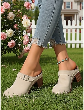 Beige, perforierte Damen-Mules – bequeme Slipper für Garten, Spaziergänge, Zuhause und sommerliche Freizeit.