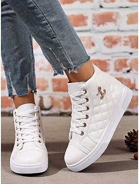 Weiße gesteppte High-Top-Sneaker für Damen, modische Plateauschuhe zum Schnüren mit goldenen Details, stylische Freizeitschuhe für den Alltag und Ausflüge