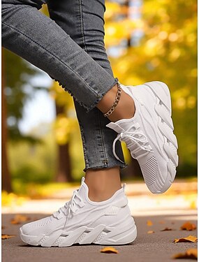 Weiße Schnür-Sneakers mit dicker Sohle für Damen – leichte, atmungsaktive Mesh-Sportschuhe zum Laufen, Gehen und für lässige Outfits