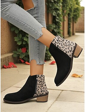 Schwarze Damen-Ankle-Boots mit Leopardenmuster – trendige Stiefeletten aus Wildlederimitat mit seitlichem Reißverschluss, perfekt für Herbstmode und Alltagsoutfits