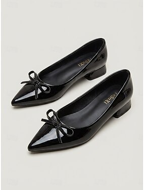 Elegante, rosafarbene Lackpumps mit niedrigem Absatz – elegante, spitz zulaufende Schuhe mit Schleife für Gartenpartys und festliche Anlässe.