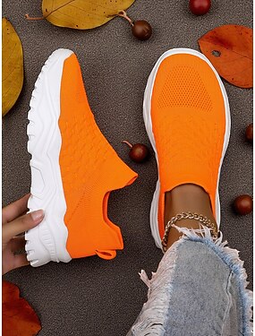 Orangefarbene Slip-On-Flyknit-Sneaker für Damen – atmungsaktive, leichte Mesh-Wanderschuhe mit dicker Sohle für Freizeit und Sport