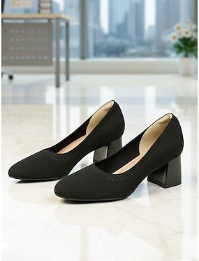 Beige und schwarze Strickpumps mit Kappe für Damen – bequeme, atmungsaktive Slipper mit Blockabsatz für den täglichen Weg zur Arbeit und fürs Büro. &professionelle Damen