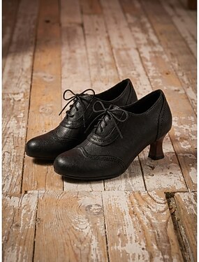 Edwardianische Vintage-Oxfordschuhe für Damen – elegante braune Schnürstiefeletten aus Kunstleder mit klassischen Brogue-Details &Spulenabsatz für Retro-Bürokleidung, akademischer Stil &historisches