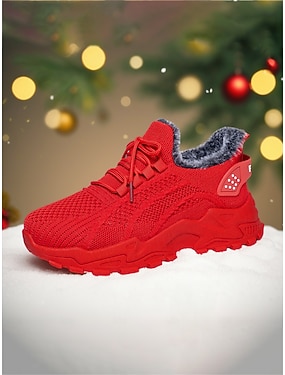 Rote, fleecegefütterte Damen-Sneaker – warme, gestrickte Freizeitschuhe mit rutschfester Sohle, bequeme Weihnachtsschuhe für Winterspaziergänge und Reisen