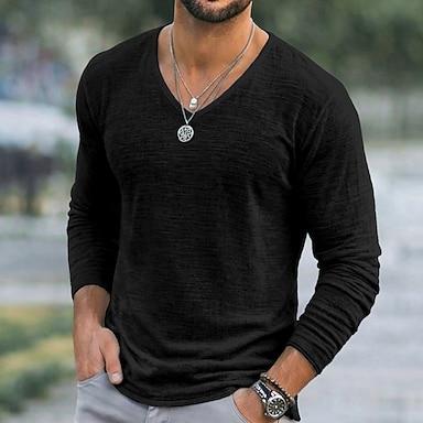 Herren T-Shirt Leinen-T-Shirt Langarm V Ausschnitt Sommer Frühling Einfarbig Einfach Texture Täglich Lässig Streetstyle Rein Lässig Outdoor Straße Blau Meerblau Schwarz Top T-Shirt für Herren