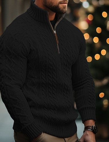 Weihnachtspullover, Herrenpullover, Pullover, Zopfmuster, regulärer Strick, Viertelreißverschluss, einfarbig, Stehkragen, modern, zeitgenössisch, Weihnachten, Arbeitskleidung, Bekleidung, Winter, Schwarz, Weiß, M, L, XL
