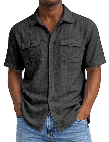 Herren Hemd Leinenhemd Popover-Hemd Sommerhemd Strandbekleidung Freizeithemd Einfarbig Urlaub Straße Schwarz Weiß Gelb Grün Kurzarm Hemdkragen Sommer Frühling Bekleidung Tasche