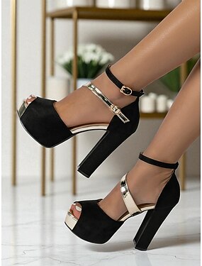 Schwarze Plateau-Sandalen für Damen mit goldenem Knöchelriemen, sexy Peep-Toe-Stiletto-Sandalen für Nachtleben-Partys und Club-Outfits