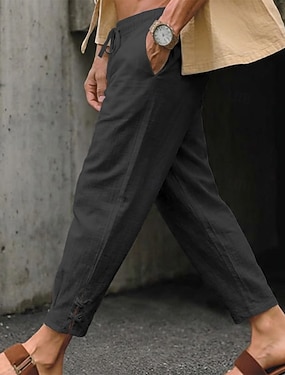 Herren Leinenhosen Sommerhose Kordelzug Elastischer Bund Seitenknopf Einfach Bequem Atmungsaktiv Volle Länge Lässig Täglich Outdoor Urlaub Klassisch Schwarz Weiß Unelastisch