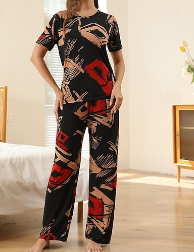 Damen EU- / US-Größe Schlafanzug Freizeitkleidung 2 Stück Lässig Komfort Druck Satin-Seidenpyjamas Nahtlos Hose Täglich Heim Kurze Hose Rundhalsausschnitt Schwarz Sommer Frühling Lässiger Schnitt