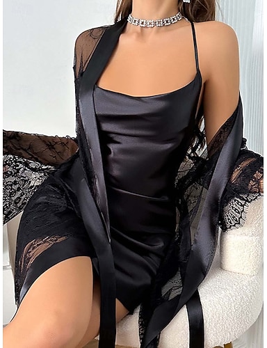Damen Freizeitkleidung Robe Nachthemd Mode Lässig Einfarbig Satin-Seidenpyjamas Patchwork Kleid Täglich Heim Urlaub Langarm V Ausschnitt Schwarz Champagner Gelb Rosa Kamel Sommer Frühling Lässiger