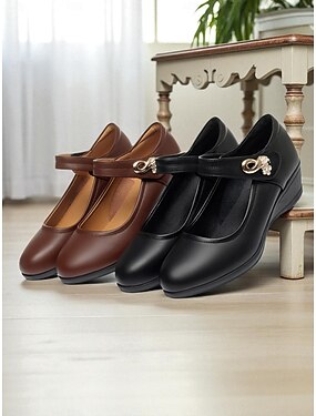 Bequeme Mary Jane-Arbeitsschuhe für Damen mit niedrigem Keilabsatz – Schwarz &braune Büro-Ballerinas aus Kunstleder mit dekorativer Schnalle für das tägliche Gehen, langes Stehen und die Arbeit im