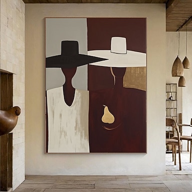 Handgefertigtes, elegantes, minimalistisches Ölgemälde mit Mann und Frau mit Hut – moderne, abstrakte Figur – für die Wanddekoration im Esszimmer – Geschenkidee